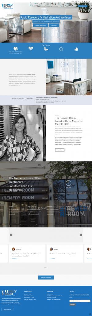 The Remedy Room is an Innovative wellness clinic focusing on optimal nutrition and preventative health through IV hydration, wellness therapy, and personalized medicine. Interesting features of the remedy room website include a live testimonials page which live pulls reviews from Yelp, Facebook and Google, a social feature which displays their posts from Facebook in an engaging layout on the social stream page and an extreme ease of editing by the clinic staff.